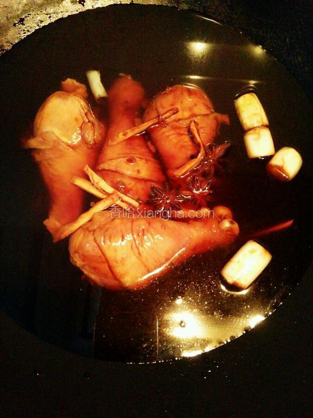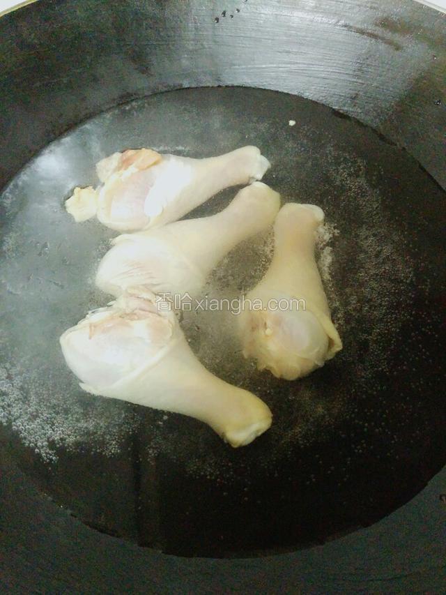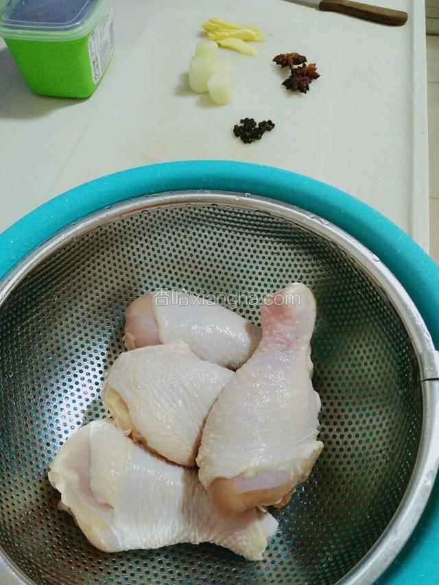 3.鸡腿洗干净后用热开水焯过,然后冷水急冲,以保证鸡皮有弹性。
