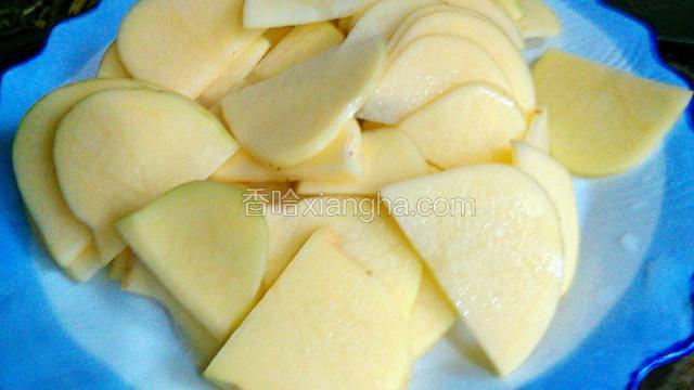 6.下土豆片,不停'的炒动,让每一片土豆片都能受热煎成金黄色。