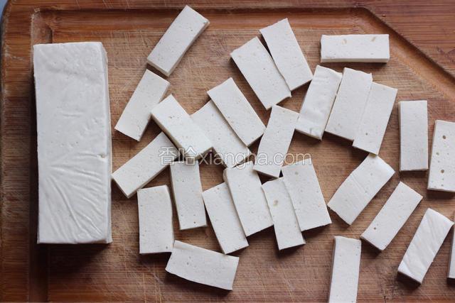 3.拿一小点的油炸锅,倒多些油,油烧至七成热,将豆腐条均匀加入油中,炸至豆腐浮上油面即可捞出。