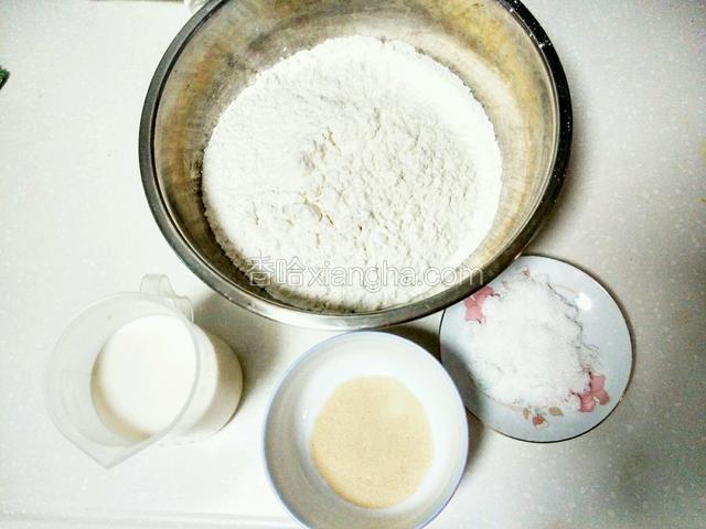 3.面粉中间挖一个洞,将用温开水化开的酵母倒入中间。将牛奶打热,打至烫手然后用热牛奶和面。