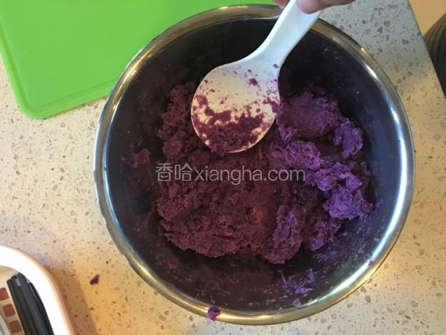 4.将蒸好的紫薯放入盆子里,稍放凉不烫手后再用饭勺将紫薯压碎。