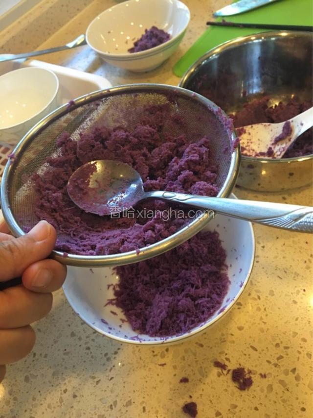 5.把压碎的紫薯放入网格很密的筛子里,用勺子反复的搓压,直至紫薯全部用筛子过一遍。