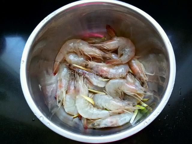 5.中大火正5-6分钟关火,过火后过再焖两三分钟取出虾,把上面的姜丝和葱段挑出去。