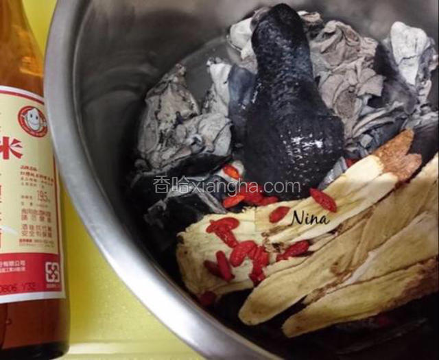5.然后把所有食材放入另外一个干净的锅中,加入一瓶料理米酒。