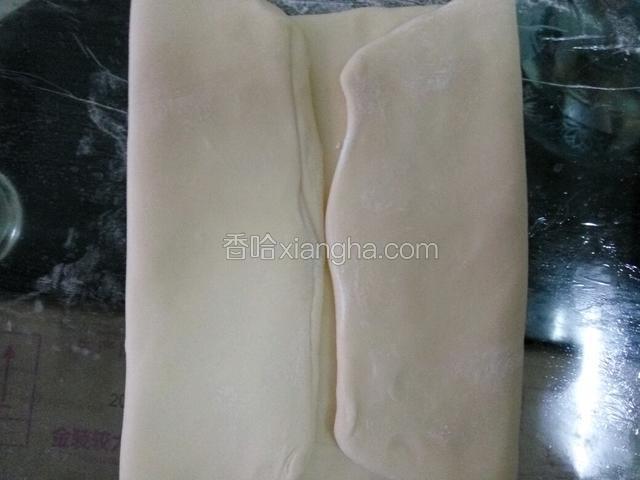 4.将面团擀成长方形,将片状黄油放在面片中间对折包住