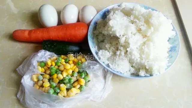1.准备好米饭,鸭蛋,玉米青豆,胡萝卜,黄瓜