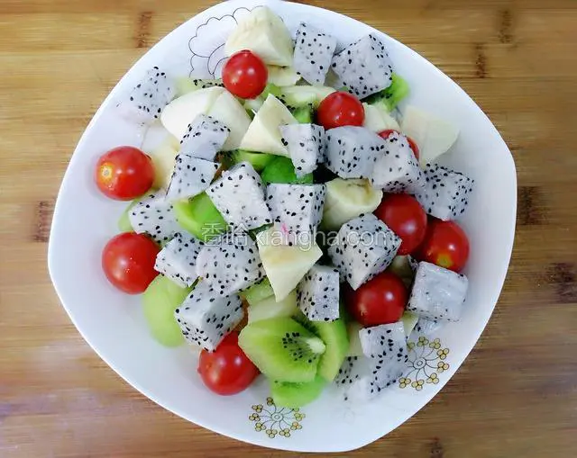 2.苹果洗净去皮切成滚刀块,猕猴桃去皮切成滚刀块,香蕉去皮切成滚刀块,火龙果去皮切成大丁,圣女果洗干净去蒂备用。