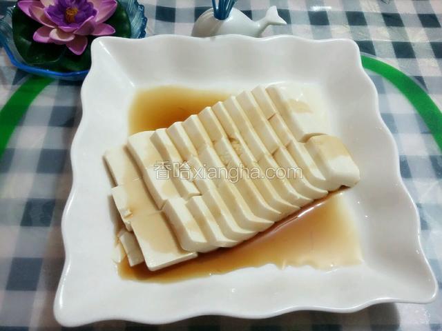 1.嫩豆腐倒扣脱盒,先在盒底划个口子,让空气进去,这样撕去正面包装纸,用刀托着倒扣,就能完整的倒出来;