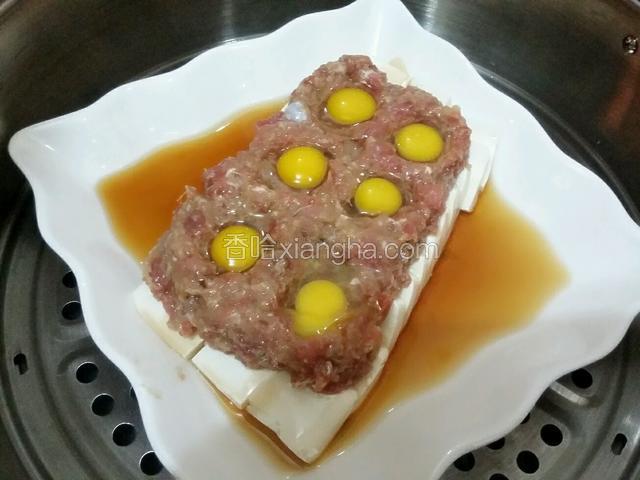 5.肉馅平铺在豆腐上,厚一点,然后用手整理出小洞,不要穿,留点底,再依次打入鹌鹑蛋;
