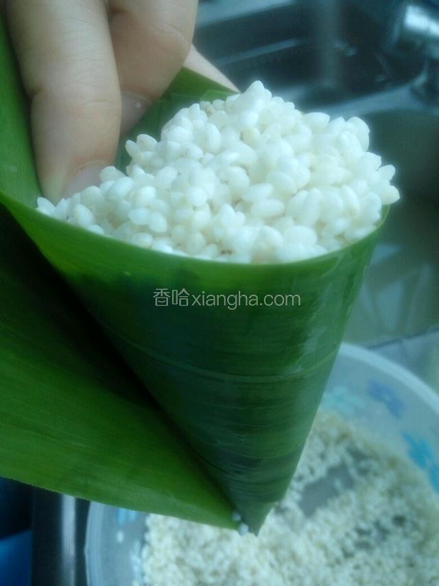 3.一次取3~4张芦叶,少许重叠并排放好,卷成圆锥状,左手持芦叶右手卷