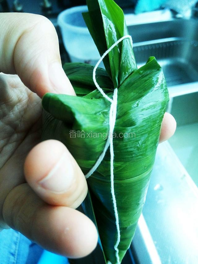 5.这时要注意手法:换作右手拿粽体,左手的中指和无名指的叉口轻轻托在椎体中下部,右手将椎体以外的芦叶盖上