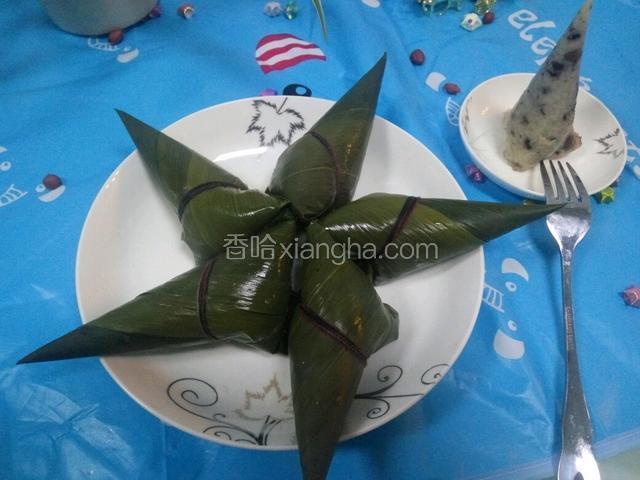 1.采好芦叶,市场上也有售,开水焯一下,头尾剪去少许