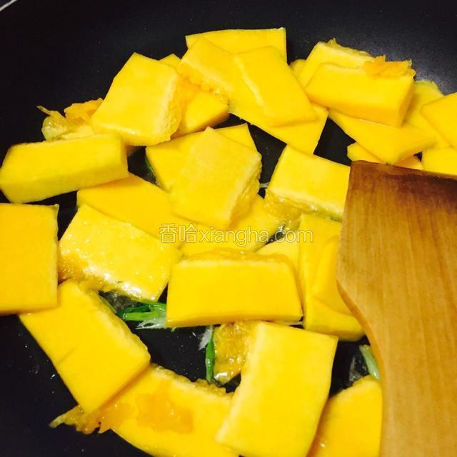 5.倒入南瓜翻炒片刻