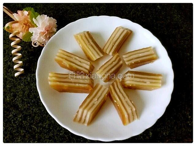 5.蒸盘放入蒸锅内,待水沸后,用汤勺勺红浆均匀浇入蒸盘,盖锅盖蒸1-2分钟,揭盖用筷子点点浆液,感觉固化了,再浇入一层白浆,以此循环操作,直至蒸盘将满或浆液完。