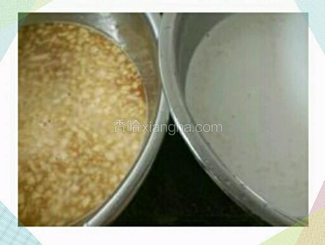 4.准备两个大盆,分别放入红糖和白糖,各加一碗温水融糖,再将3步骤的马蹄粉浆和椰浆、马蹄粒对半倒入两盆,就兑好了红白两盆浆液。