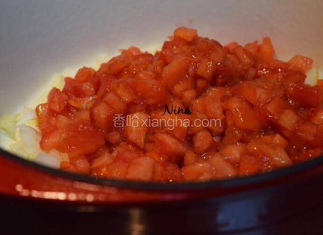6.番茄表面划十字,放入开水中烫1-2分钟,很容易去掉皮,然后切成小丁备用。