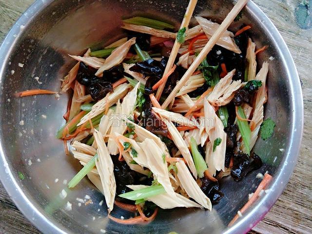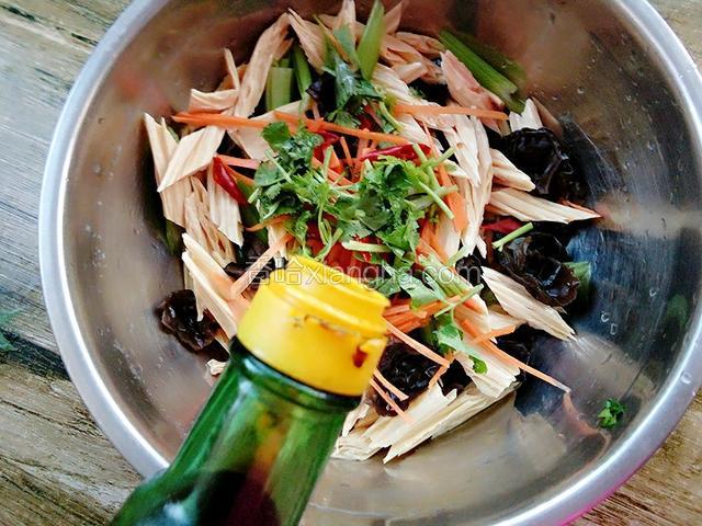 3.将泡发的腐竹和木耳捞出
