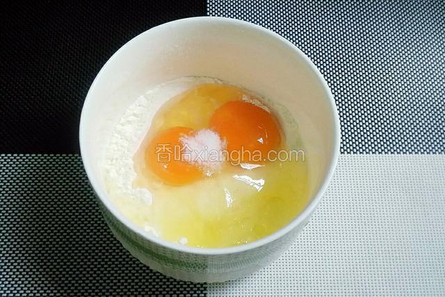 2.碗里倒入面粉,打入鸡蛋,加入油盐,再倒入水搅拌均匀。
