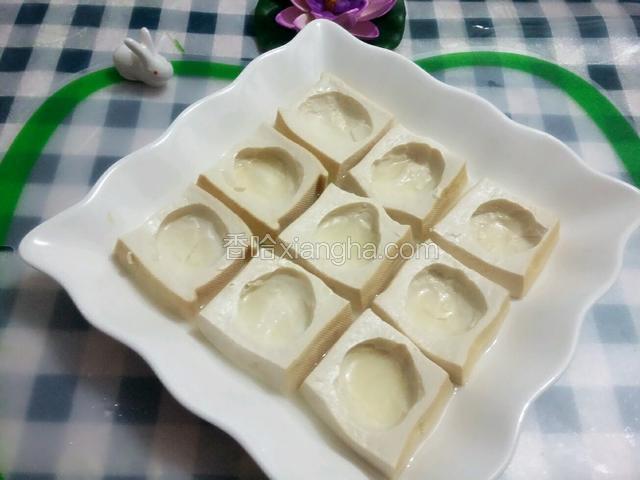 3.用小勺挖出孔,留底不要穿,挖出的碎豆腐用来烧汤,不要浪费;