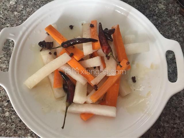 4.白萝卜同上,胡萝卜,白萝卜放入容器中撒适量盐拌匀腌制一小时,腌好的萝卜倒掉腌出来的水份用凉开水浸泡十五分钟沥干水分备用