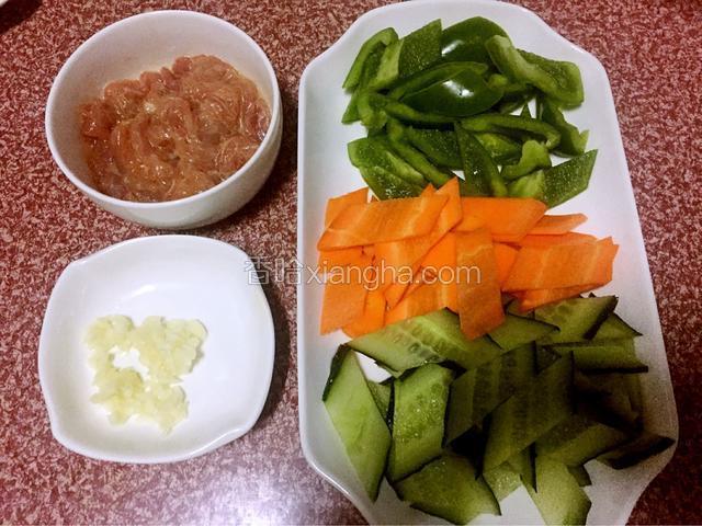2.猪肉洗净切薄片,用适量的盐、鸡精、生抽、淀粉、油抓匀腌制半小时,青椒、黄瓜、胡萝卜切菱片,蒜切末备用