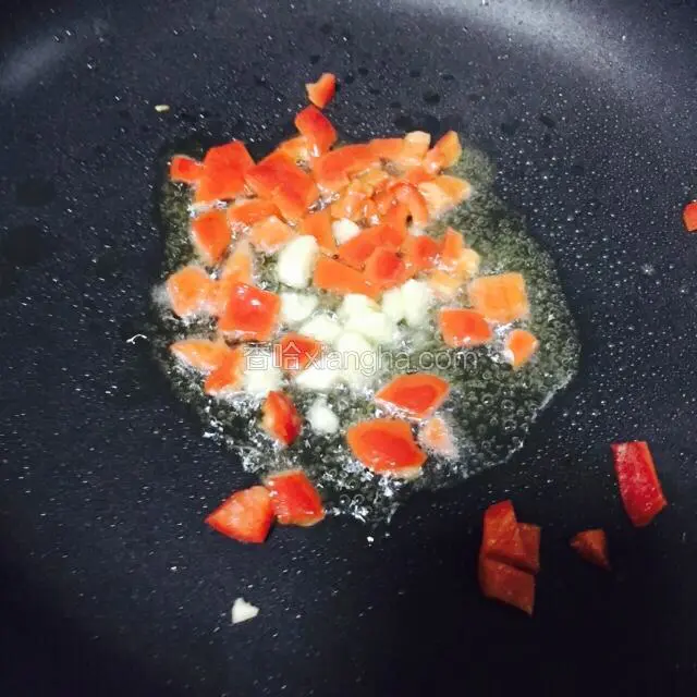 5.锅中放入适量油倒入蒜和红辣椒爆香