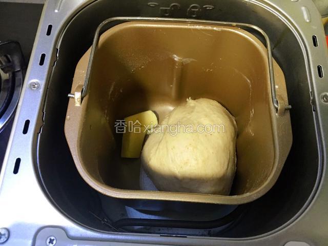 1.将原材料(黄油、蜂蜜除外)依次放面包桶中,启动面包机的和面程序半小时,