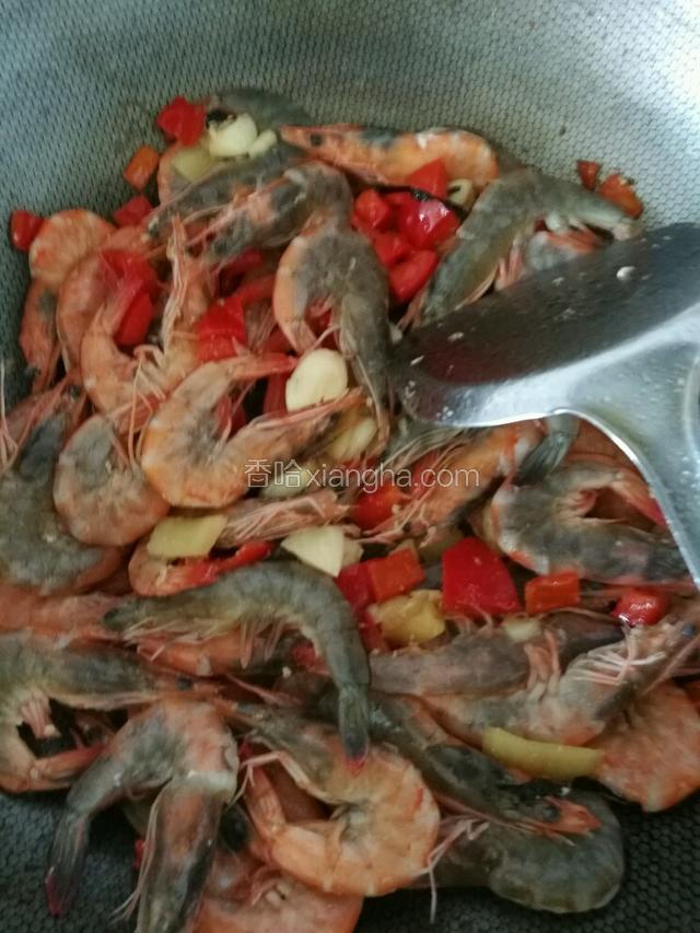 5.把姜大蒜红辣椒,放入油锅爆炒1分钟左右