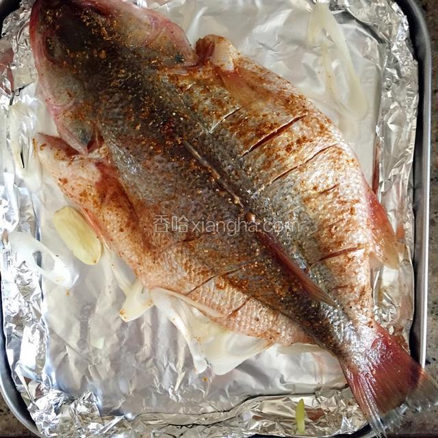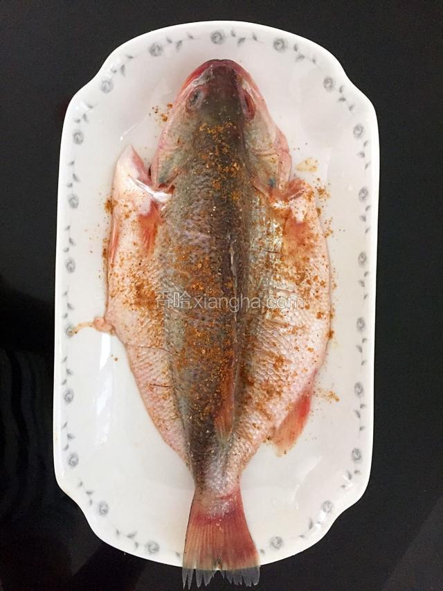 1.鲈鱼洗净切开不切断,用花椒油、盐、孜然粉、白胡椒粉二面涂好腌二小时