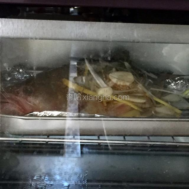 5.鲈鱼下面放土豆瓜,大蒜、姜片。烤箱預热230度