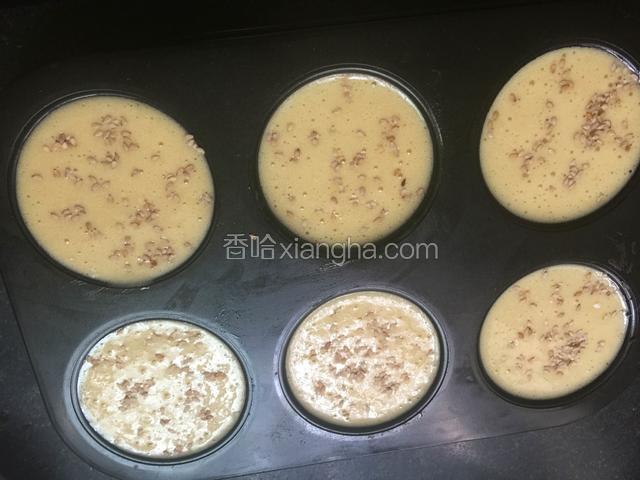 3.倒入模具,我做的就是六个的量,一点不剩也不多。震几个,震出气泡。