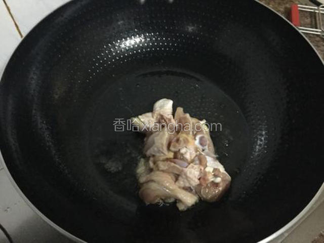 3.锅中倒入适量的油烧热后放入鸡腿肉炒至变色变白