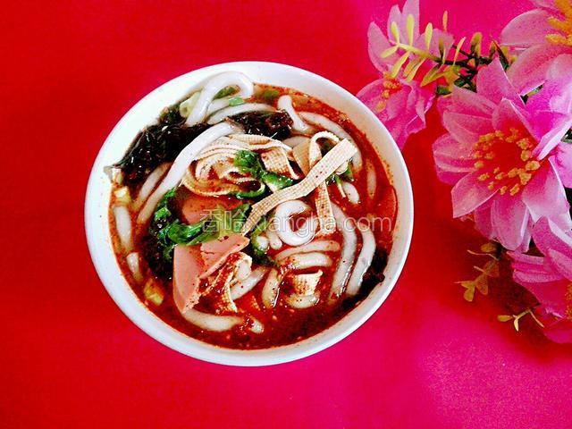 5.把土豆粉,豆腐皮,生菜盛入碗里,加点汤。