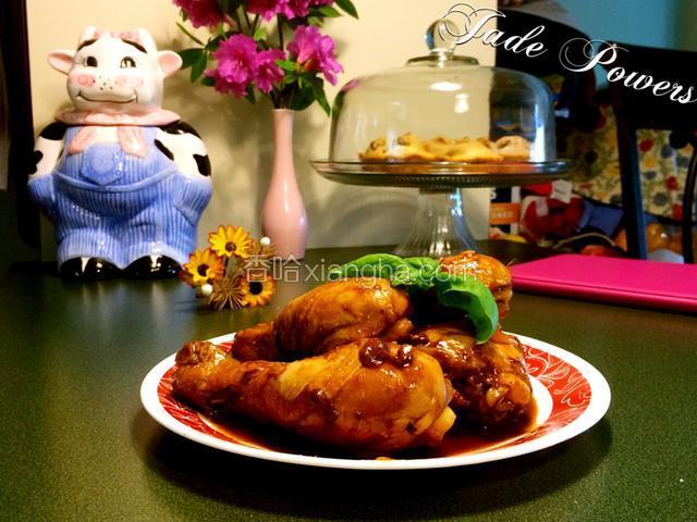 4.鸡腿逐个抹上红烧酱汁,待糖融化加入锅煎至金黄;