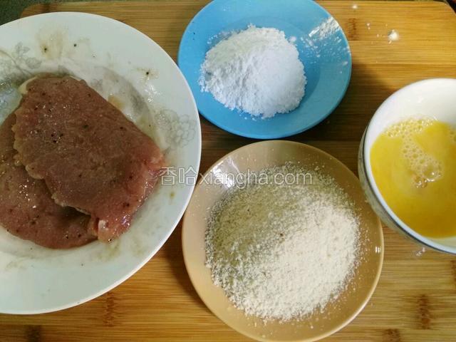 6.鸡蛋打散 分别用盘装生粉 和面包糠