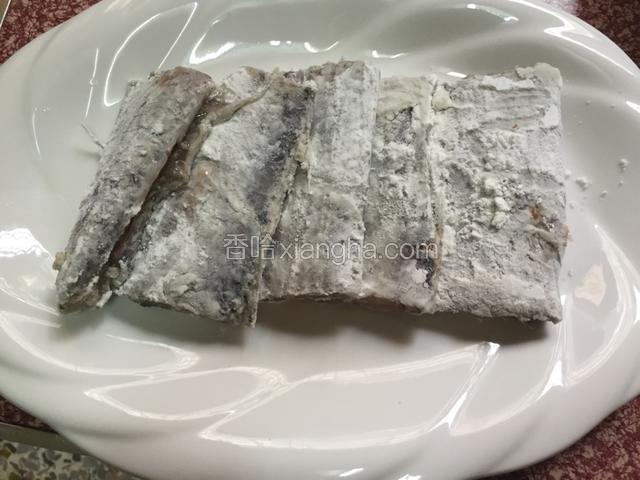 3.把带鱼的腌料去掉,放在淀粉上滚一滚,让其表面裹上一层薄薄的淀粉