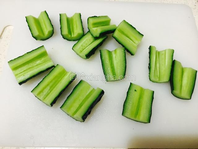 1.将黄瓜表皮的小疙瘩用刀轻轻刮去、洗净,切掉两头。
