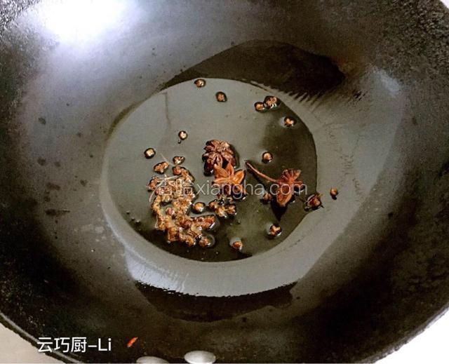 6.锅里放油、油温加热7成、放八角、花椒大火爆香。