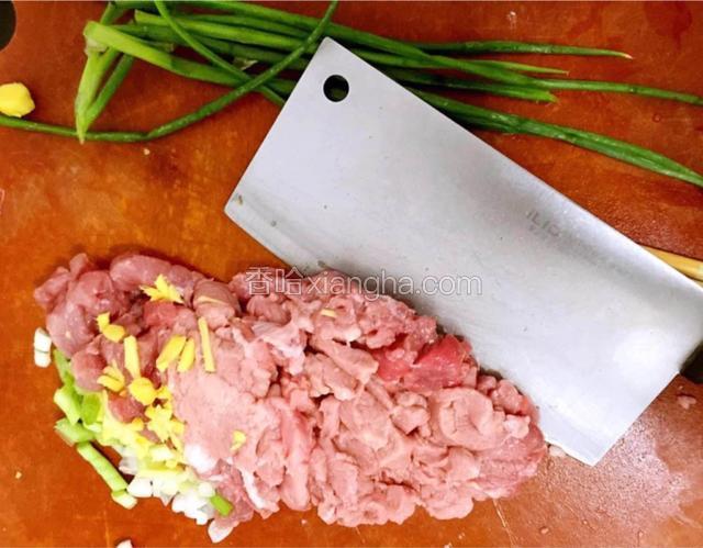 3.接下來剁肉末,葱白、姜一起剁成泥,葱叶切小葱花