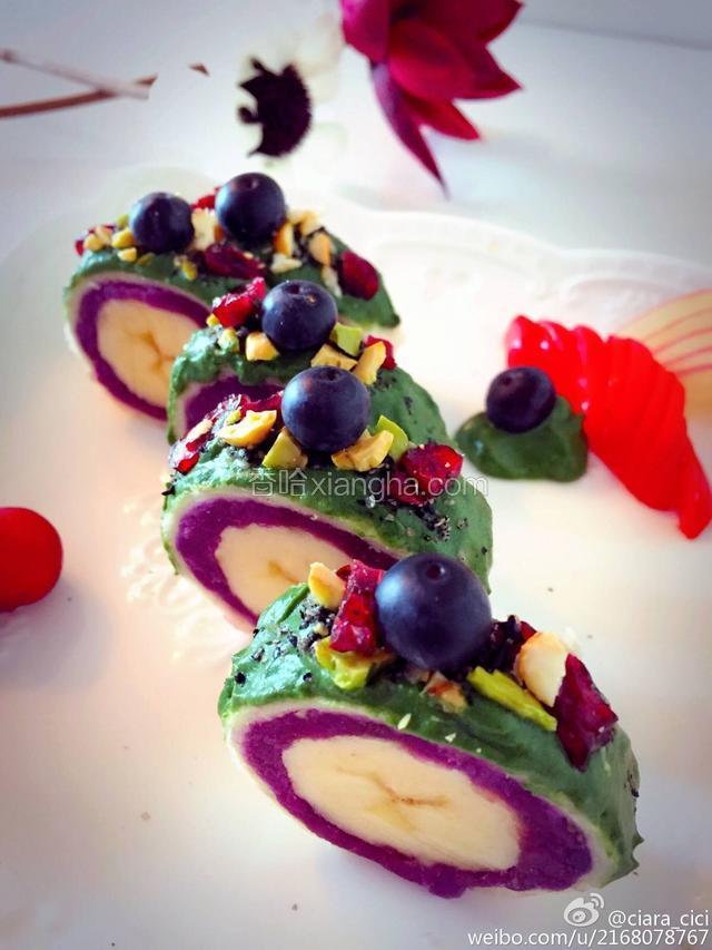 1.把面包边去掉 用擀面杖把面包压扁 涂上蒸熟的紫薯 如果紫薯太干 里面可以加点蜂蜜水或者蓝莓酱 口感更加 放上香蕉 慢慢卷起来
