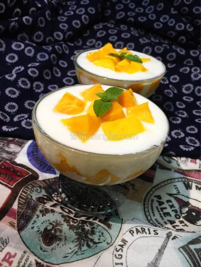 6.把剩下的芒果放酸奶上面,薄荷叶装饰即可
