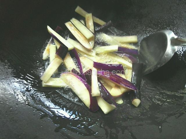 4.净锅放适量油中小火把茄子炸制软化且熟透捞出控油备用