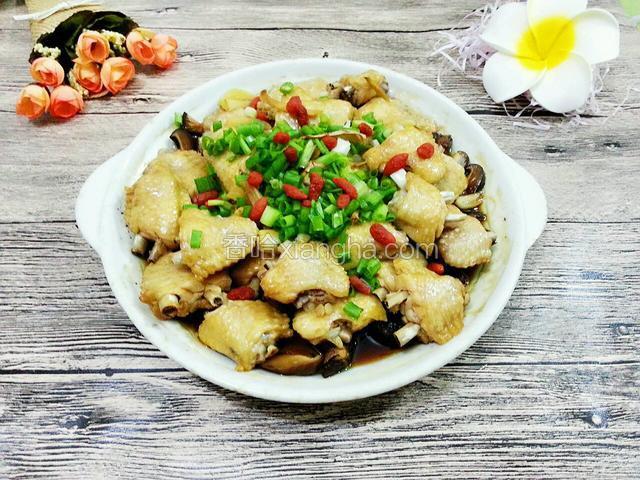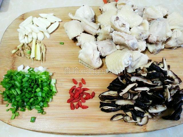 5.鸡翅洗净,香菇洗净切片,姜切丝,蒜切片,小葱切末,枸杞用水泡开