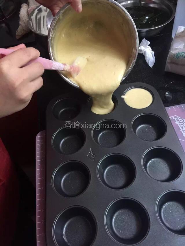 1.所有材料称重,蛋液里加糖打发,分两次筛入面粉