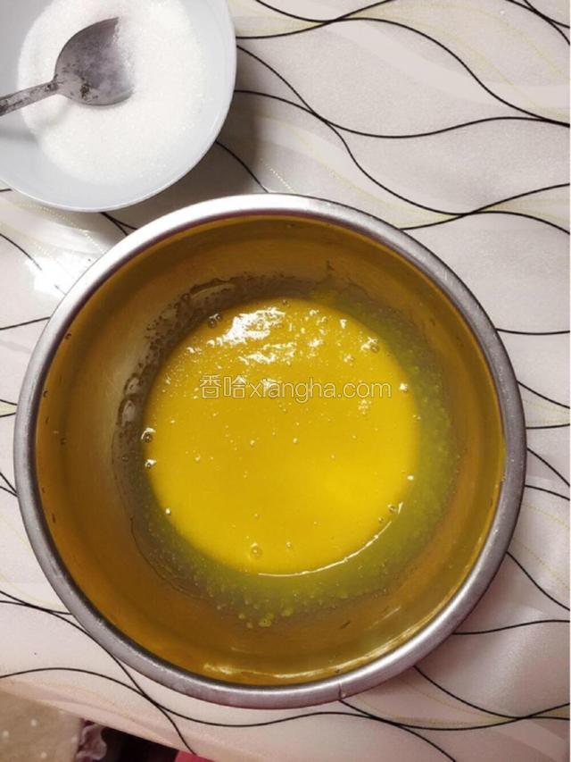 5.舀两勺白糖放进打散的蛋黄中,搅拌均匀。然后再倒入牛奶,搅拌均匀,之后再倒入玉米油,搅拌均匀,直到水油不分离。然后再倒入面粉,搅拌,不能划圈,不然会造成面粉起筋。搅拌时要画十字,或者像炒菜一样上下翻。搅拌均匀到光滑无颗粒就可以了。