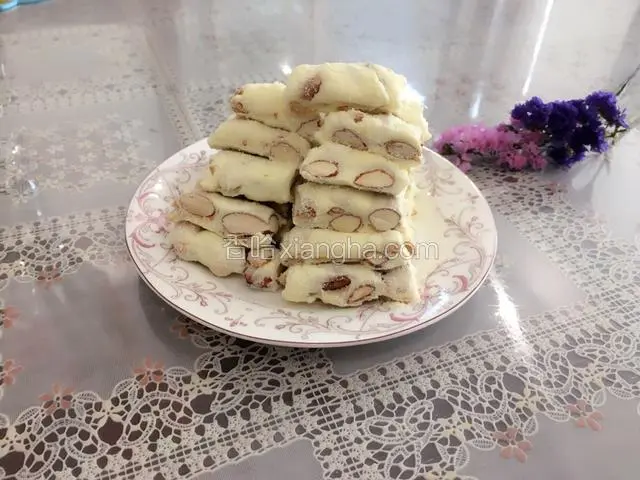 6.切成我们想要的大小,用我们准备的10g奶粉,沾在每一粒糖上,防止糖粘在一起。图中可以看到我们放的杏仁了~自己做的就是好,料多~