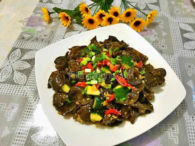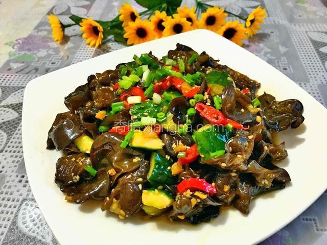 6.将煮好的汤汁淋在拌好的木耳黄瓜上