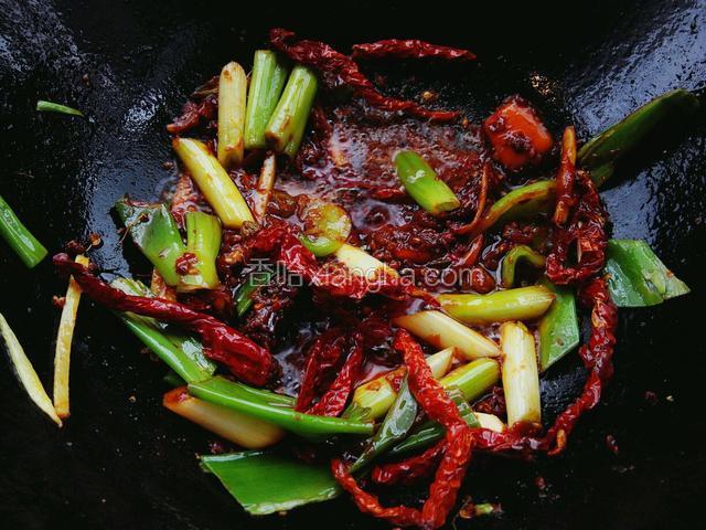 6.锅中倒入少量油爆香葱,姜,干辣椒和花椒粒