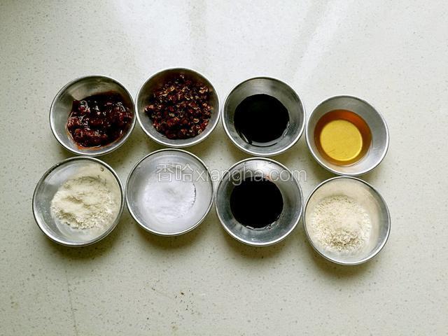 2.准备好豆瓣酱,花椒,老抽,生抽,料酒,盐,鸡粉和味精备用。