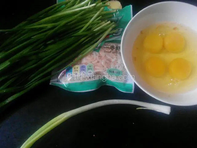 5.等鸡蛋碎凉了放入切好的葱花,韭菜和虾皮
